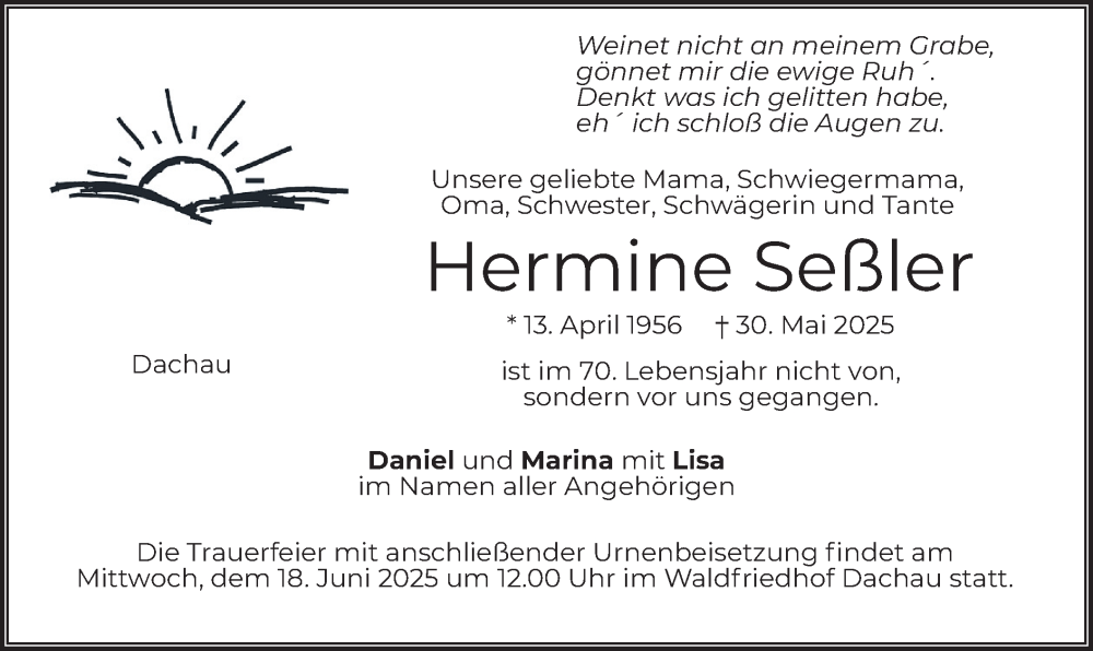 Hier finden Sie alle Traueranzeigen aus der Zeitung, die bisher für Hermine Seßler erschienen sind. Weitere Traueranzeigen, die in der Zeitung erscheinen, werden hier ebenfalls aufgelistet