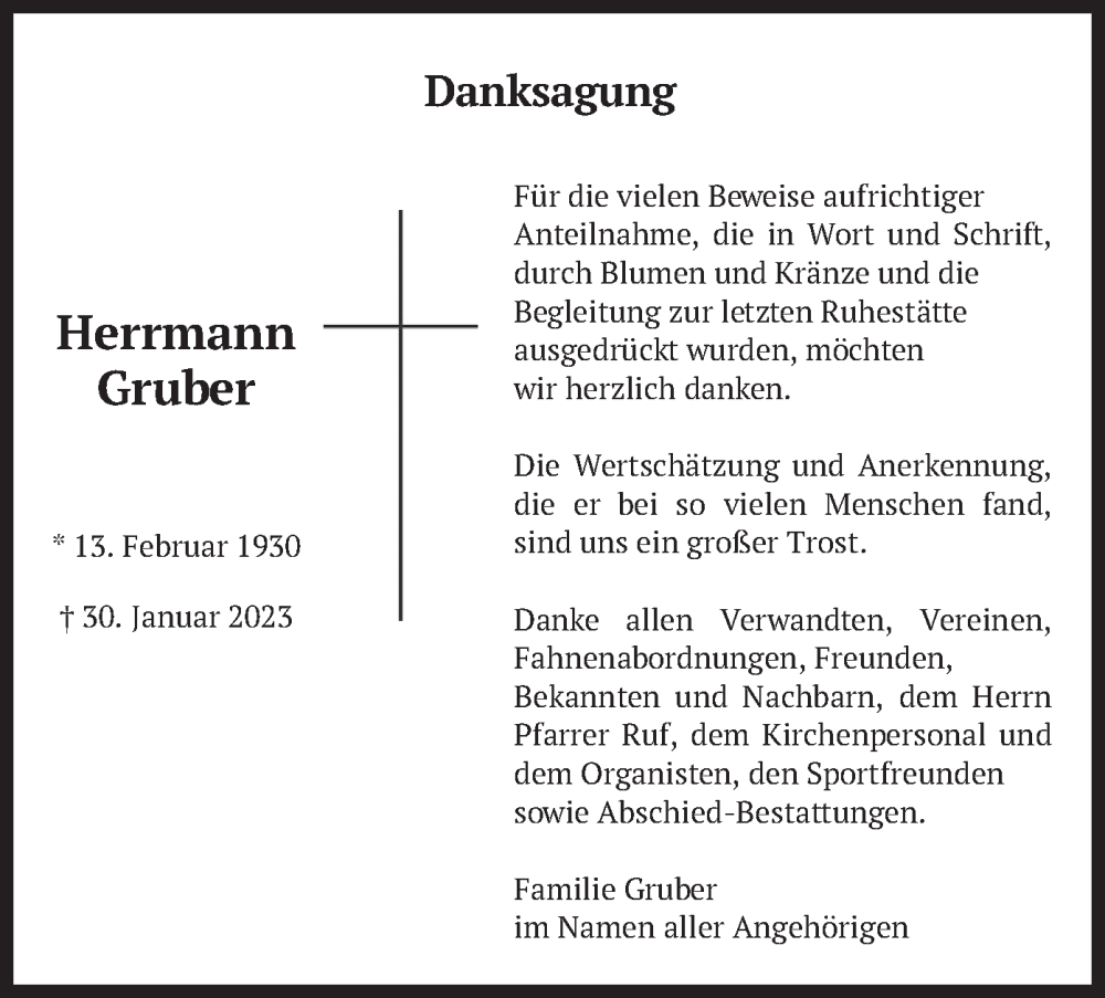 Hier finden Sie alle Traueranzeigen aus der Zeitung, die bisher für Herrmann Gruber erschienen sind. Weitere Traueranzeigen, die in der Zeitung erscheinen, werden hier ebenfalls aufgelistet