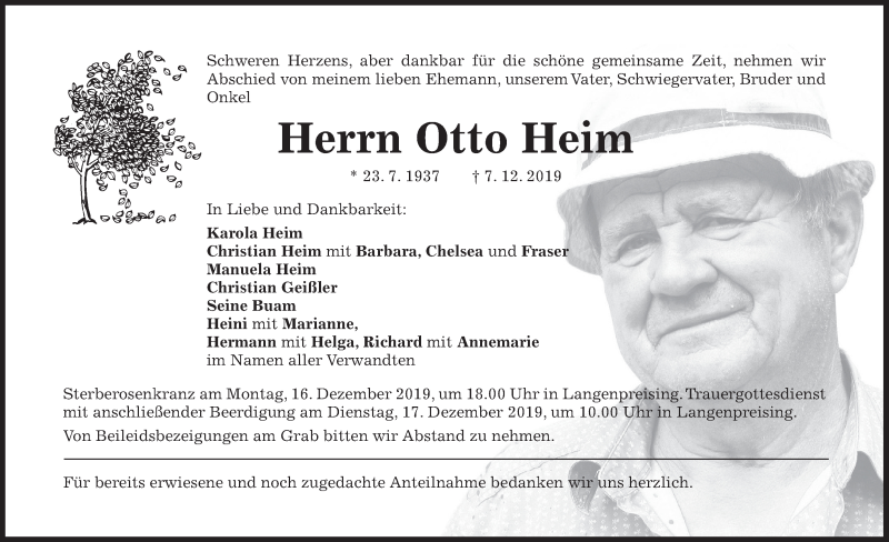 Hier finden Sie alle Traueranzeigen aus der Zeitung, die bisher für Herrn Otto Heim erschienen sind. Weitere Traueranzeigen, die in der Zeitung erscheinen, werden hier ebenfalls aufgelistet