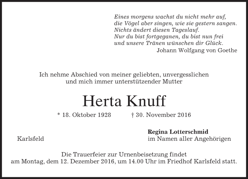 Hier finden Sie alle Traueranzeigen aus der Zeitung, die bisher für Herta Knuff erschienen sind. Weitere Traueranzeigen, die in der Zeitung erscheinen, werden hier ebenfalls aufgelistet
