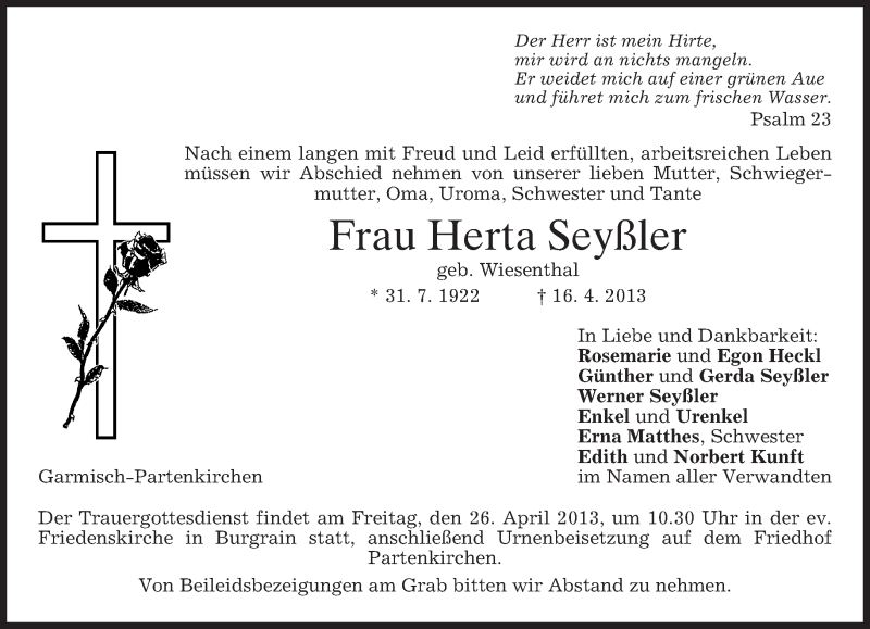 Hier finden Sie alle Traueranzeigen aus der Zeitung, die bisher für Herta Seyßler erschienen sind. Weitere Traueranzeigen, die in der Zeitung erscheinen, werden hier ebenfalls aufgelistet