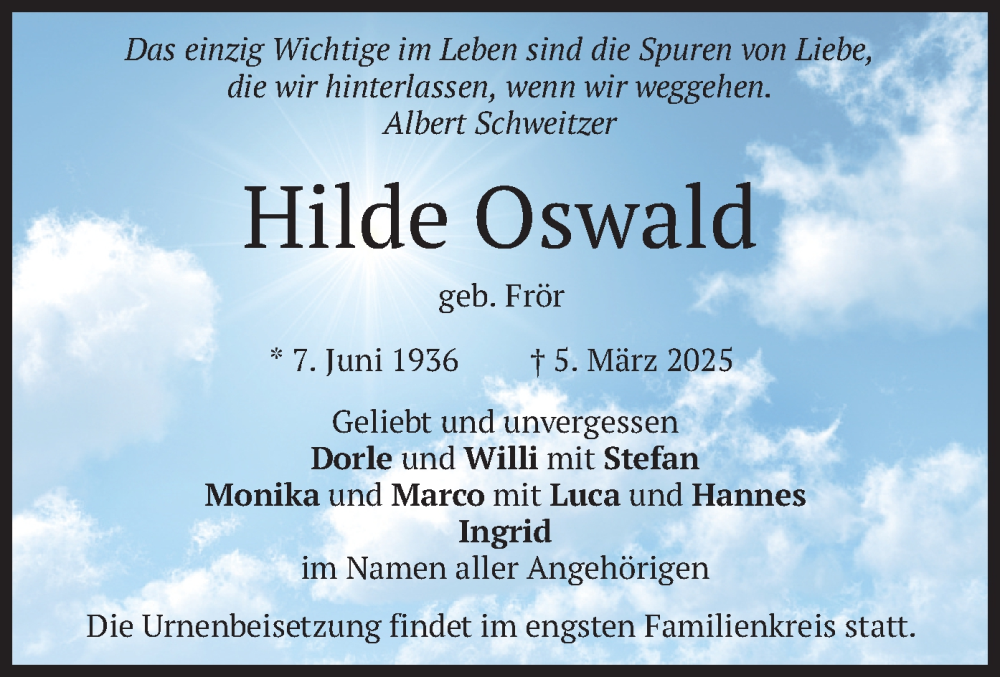 Hier finden Sie alle Traueranzeigen aus der Zeitung, die bisher für Hilde Oswald erschienen sind. Weitere Traueranzeigen, die in der Zeitung erscheinen, werden hier ebenfalls aufgelistet