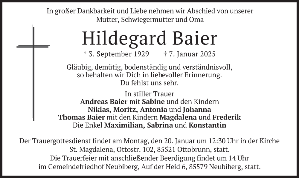Hier finden Sie alle Traueranzeigen aus der Zeitung, die bisher für Hildegard Baier erschienen sind. Weitere Traueranzeigen, die in der Zeitung erscheinen, werden hier ebenfalls aufgelistet