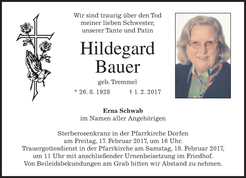 Hier finden Sie alle Traueranzeigen aus der Zeitung, die bisher für Hildegard Bauer erschienen sind. Weitere Traueranzeigen, die in der Zeitung erscheinen, werden hier ebenfalls aufgelistet
