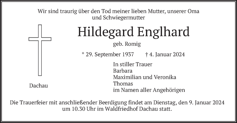 Hier finden Sie alle Traueranzeigen aus der Zeitung, die bisher für Hildegard Englhard erschienen sind. Weitere Traueranzeigen, die in der Zeitung erscheinen, werden hier ebenfalls aufgelistet
