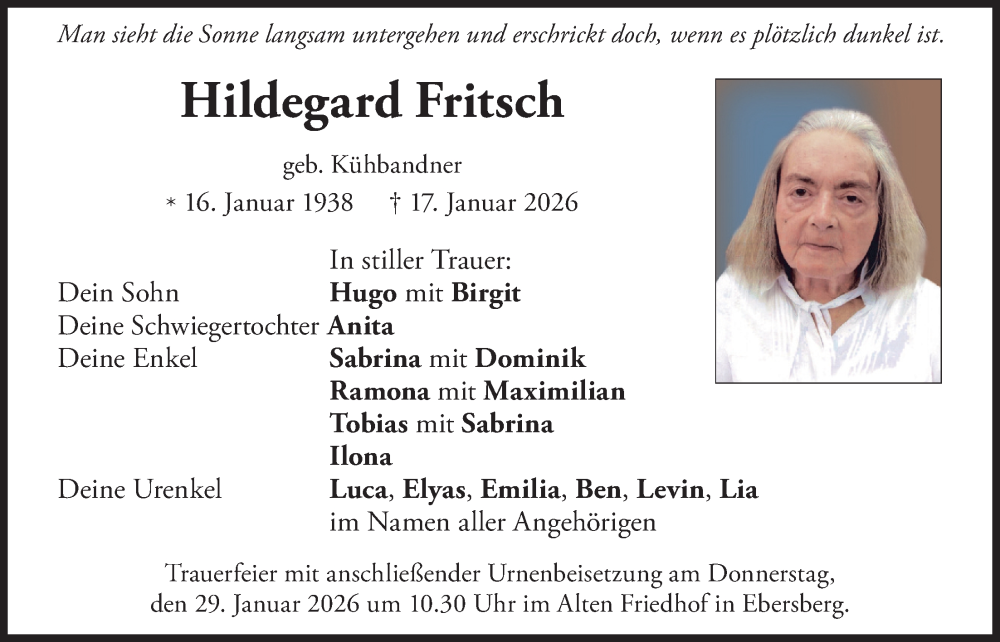 Hier finden Sie alle Traueranzeigen aus der Zeitung, die bisher für Hildegard Fritsch erschienen sind. Weitere Traueranzeigen, die in der Zeitung erscheinen, werden hier ebenfalls aufgelistet