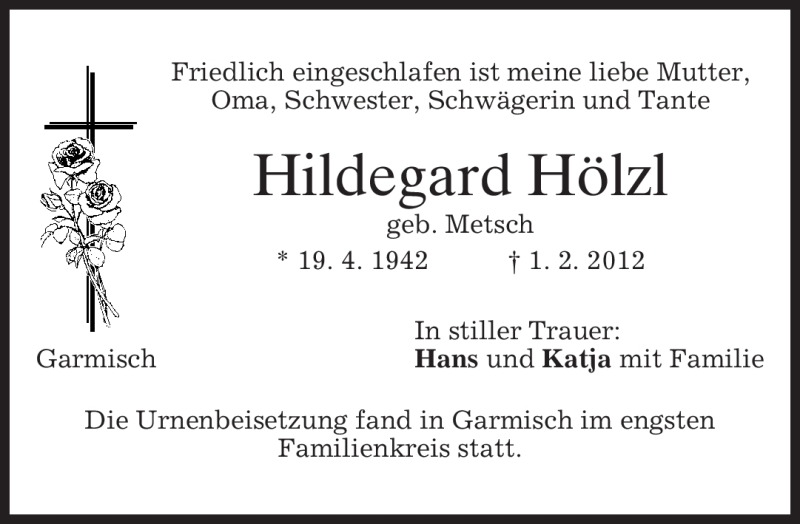 Hier finden Sie alle Traueranzeigen aus der Zeitung, die bisher für Hildegard Hölzl erschienen sind. Weitere Traueranzeigen, die in der Zeitung erscheinen, werden hier ebenfalls aufgelistet
