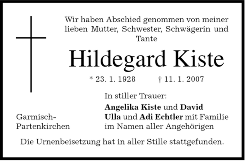 Hier finden Sie alle Traueranzeigen aus der Zeitung, die bisher für Hildegard Kiste erschienen sind. Weitere Traueranzeigen, die in der Zeitung erscheinen, werden hier ebenfalls aufgelistet