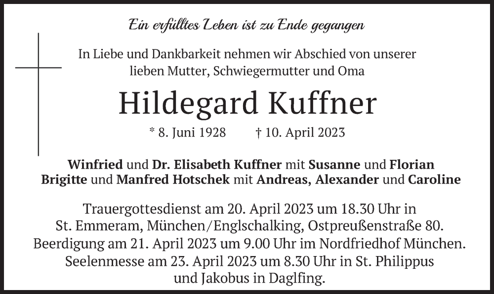 Hier finden Sie alle Traueranzeigen aus der Zeitung, die bisher für Hildegard Kuffner erschienen sind. Weitere Traueranzeigen, die in der Zeitung erscheinen, werden hier ebenfalls aufgelistet