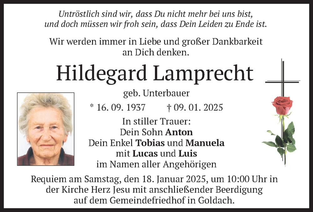 Hier finden Sie alle Traueranzeigen aus der Zeitung, die bisher für Hildegard Lamprecht erschienen sind. Weitere Traueranzeigen, die in der Zeitung erscheinen, werden hier ebenfalls aufgelistet