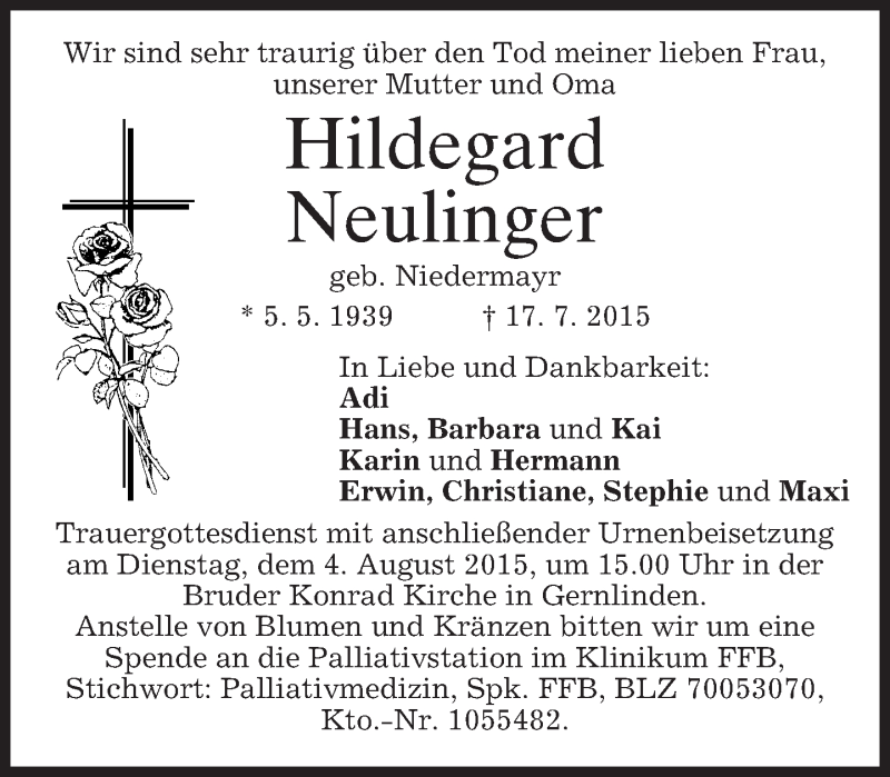 Hier finden Sie alle Traueranzeigen aus der Zeitung, die bisher für Hildegard Neulinger erschienen sind. Weitere Traueranzeigen, die in der Zeitung erscheinen, werden hier ebenfalls aufgelistet
