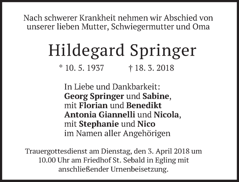 Hier finden Sie alle Traueranzeigen aus der Zeitung, die bisher für Hildegard Springer erschienen sind. Weitere Traueranzeigen, die in der Zeitung erscheinen, werden hier ebenfalls aufgelistet