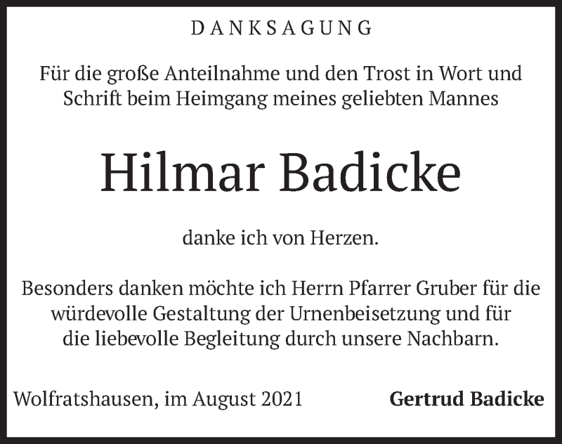 Hier finden Sie alle Traueranzeigen aus der Zeitung, die bisher für Hilmar Badicke erschienen sind. Weitere Traueranzeigen, die in der Zeitung erscheinen, werden hier ebenfalls aufgelistet