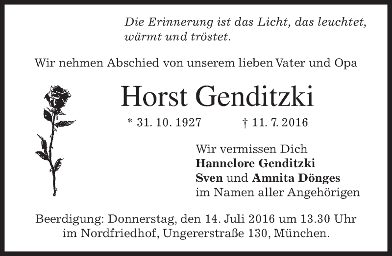 Hier finden Sie alle Traueranzeigen aus der Zeitung, die bisher für Horst Genditzki erschienen sind. Weitere Traueranzeigen, die in der Zeitung erscheinen, werden hier ebenfalls aufgelistet