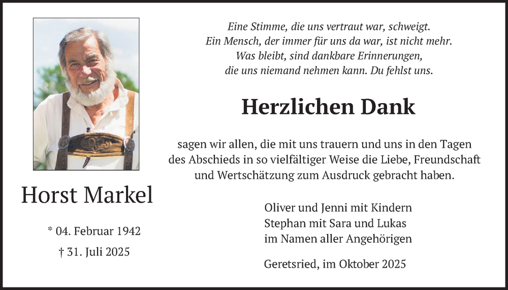 Hier finden Sie alle Traueranzeigen aus der Zeitung, die bisher für Horst Markel erschienen sind. Weitere Traueranzeigen, die in der Zeitung erscheinen, werden hier ebenfalls aufgelistet