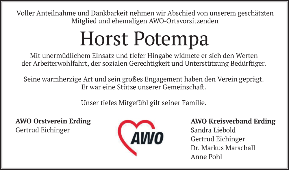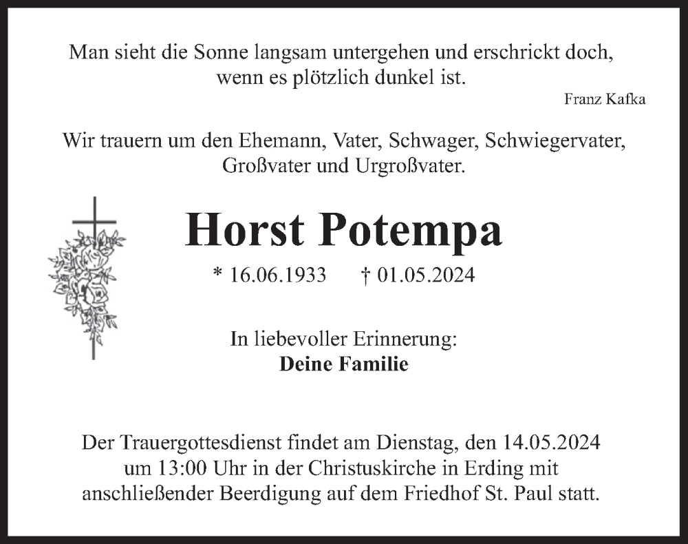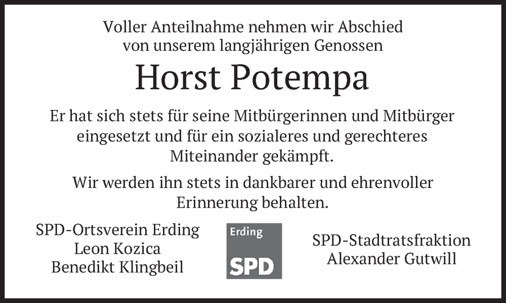 Hier finden Sie alle Traueranzeigen aus der Zeitung, die bisher für Horst Potempa erschienen sind. Weitere Traueranzeigen, die in der Zeitung erscheinen, werden hier ebenfalls aufgelistet