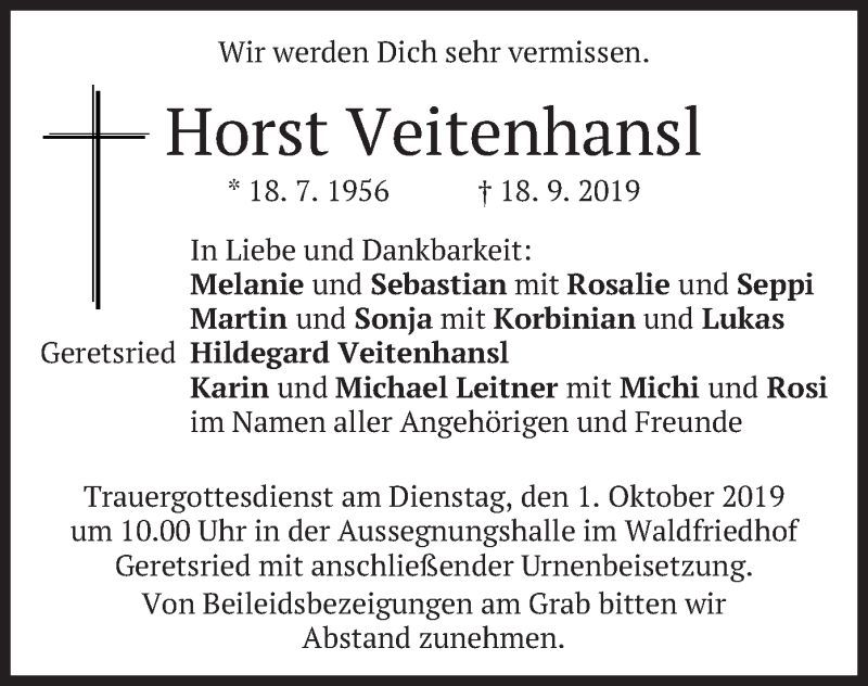 Hier finden Sie alle Traueranzeigen aus der Zeitung, die bisher für Horst Veitenhansl erschienen sind. Weitere Traueranzeigen, die in der Zeitung erscheinen, werden hier ebenfalls aufgelistet