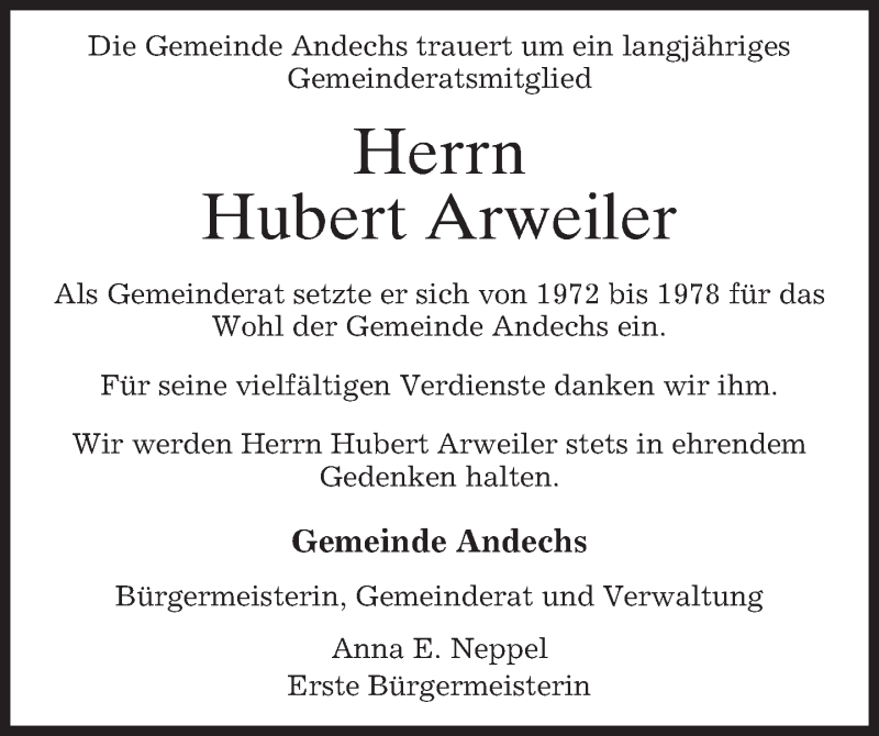Hier finden Sie alle Traueranzeigen aus der Zeitung, die bisher für Hubert Arweiler erschienen sind. Weitere Traueranzeigen, die in der Zeitung erscheinen, werden hier ebenfalls aufgelistet