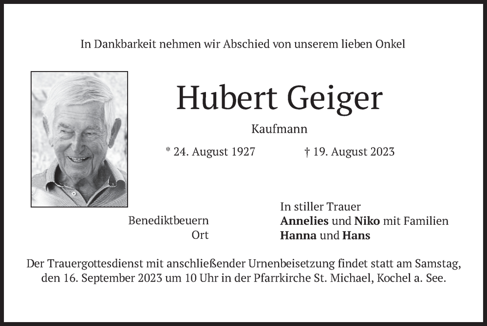Hier finden Sie alle Traueranzeigen aus der Zeitung, die bisher für Hubert Geiger erschienen sind. Weitere Traueranzeigen, die in der Zeitung erscheinen, werden hier ebenfalls aufgelistet