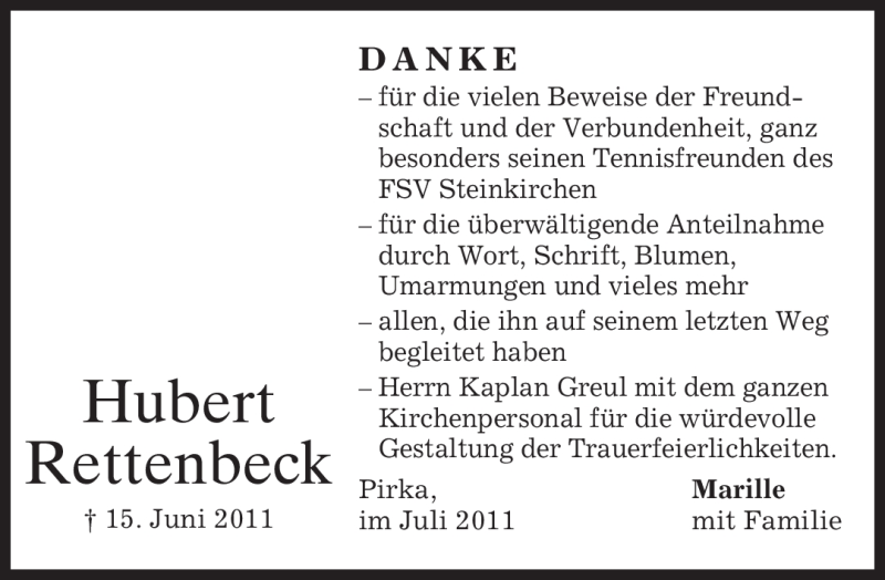 Hier finden Sie alle Traueranzeigen aus der Zeitung, die bisher für Hubert Rettenbeck erschienen sind. Weitere Traueranzeigen, die in der Zeitung erscheinen, werden hier ebenfalls aufgelistet