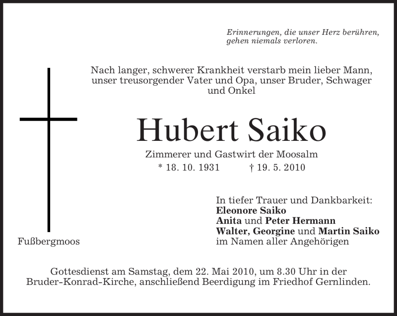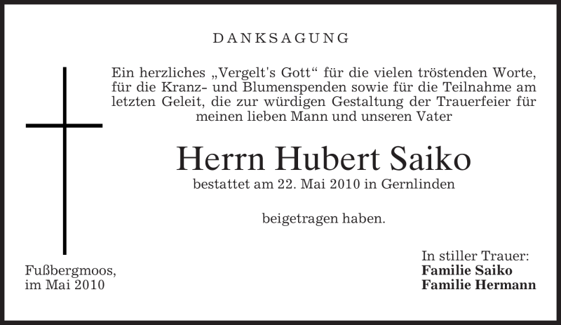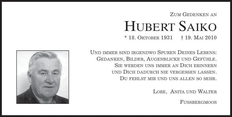 Hier finden Sie alle Traueranzeigen aus der Zeitung, die bisher für Hubert Saiko erschienen sind. Weitere Traueranzeigen, die in der Zeitung erscheinen, werden hier ebenfalls aufgelistet