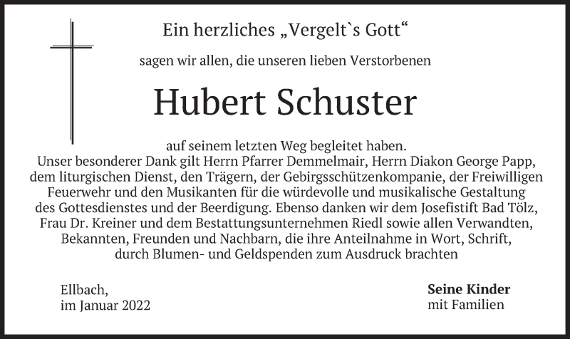Hier finden Sie alle Traueranzeigen aus der Zeitung, die bisher für Hubert Schuster erschienen sind. Weitere Traueranzeigen, die in der Zeitung erscheinen, werden hier ebenfalls aufgelistet