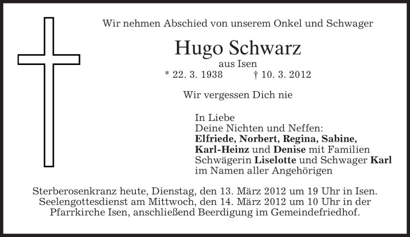 Hier finden Sie alle Traueranzeigen aus der Zeitung, die bisher für Hugo Schwarz erschienen sind. Weitere Traueranzeigen, die in der Zeitung erscheinen, werden hier ebenfalls aufgelistet