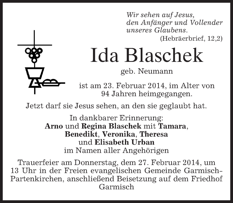 Hier finden Sie alle Traueranzeigen aus der Zeitung, die bisher für Ida Blaschek erschienen sind. Weitere Traueranzeigen, die in der Zeitung erscheinen, werden hier ebenfalls aufgelistet
