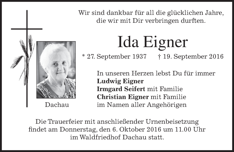 Hier finden Sie alle Traueranzeigen aus der Zeitung, die bisher für Ida Eigner erschienen sind. Weitere Traueranzeigen, die in der Zeitung erscheinen, werden hier ebenfalls aufgelistet