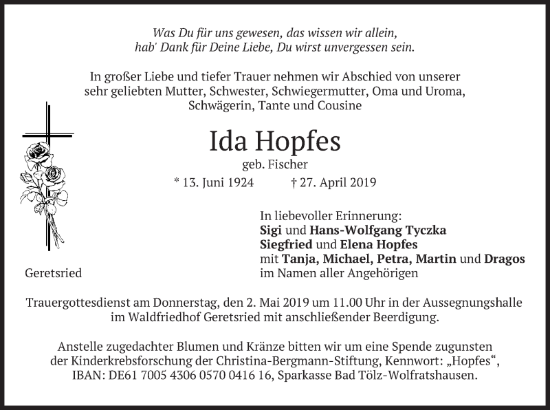 Hier finden Sie alle Traueranzeigen aus der Zeitung, die bisher für Ida Hopfes erschienen sind. Weitere Traueranzeigen, die in der Zeitung erscheinen, werden hier ebenfalls aufgelistet