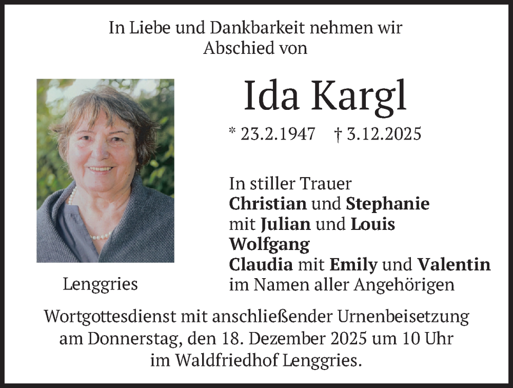 Hier finden Sie alle Traueranzeigen aus der Zeitung, die bisher für Ida Kargl erschienen sind. Weitere Traueranzeigen, die in der Zeitung erscheinen, werden hier ebenfalls aufgelistet
