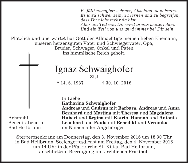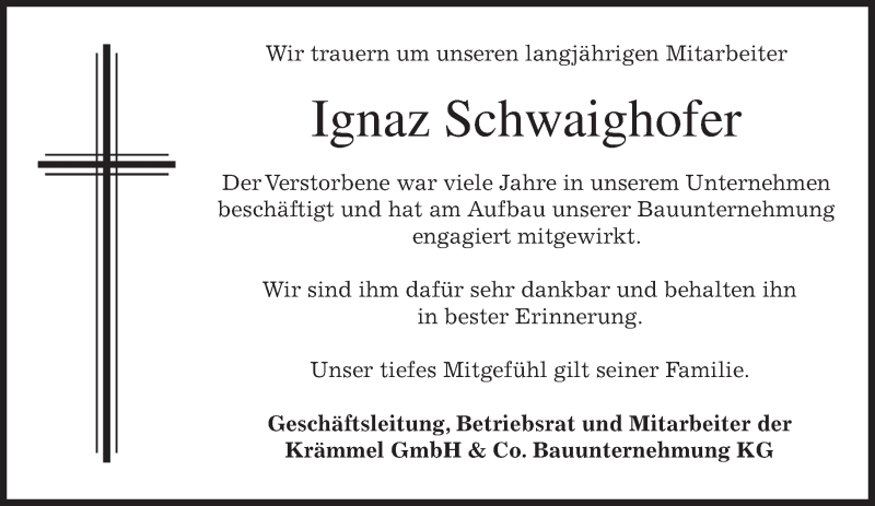 Hier finden Sie alle Traueranzeigen aus der Zeitung, die bisher für Ignaz Schwaighofer erschienen sind. Weitere Traueranzeigen, die in der Zeitung erscheinen, werden hier ebenfalls aufgelistet