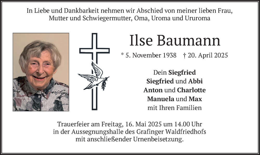 Hier finden Sie alle Traueranzeigen aus der Zeitung, die bisher für Ilse Baumann erschienen sind. Weitere Traueranzeigen, die in der Zeitung erscheinen, werden hier ebenfalls aufgelistet
