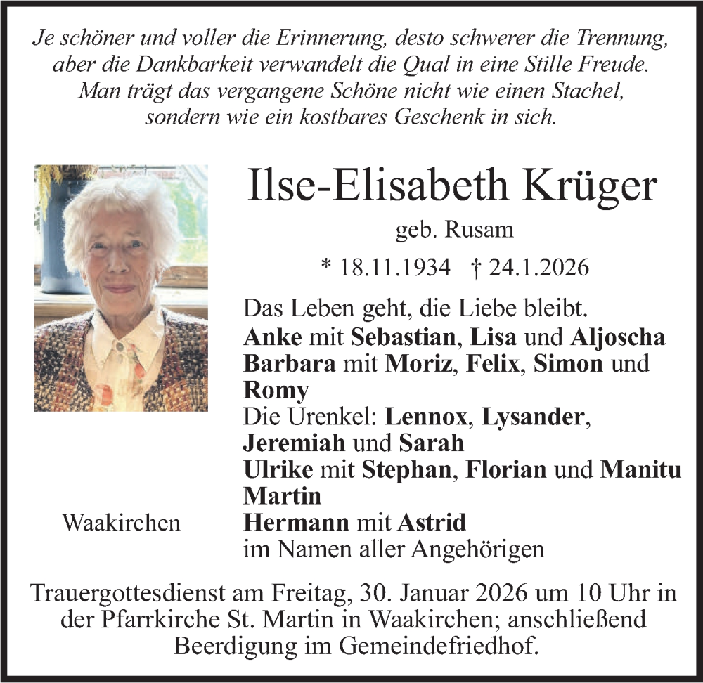Hier finden Sie alle Traueranzeigen aus der Zeitung, die bisher für Ilse-Elisabeth Krüger erschienen sind. Weitere Traueranzeigen, die in der Zeitung erscheinen, werden hier ebenfalls aufgelistet