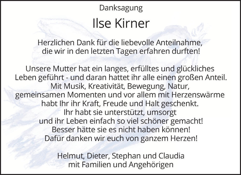 Hier finden Sie alle Traueranzeigen aus der Zeitung, die bisher für Ilse Kirner erschienen sind. Weitere Traueranzeigen, die in der Zeitung erscheinen, werden hier ebenfalls aufgelistet