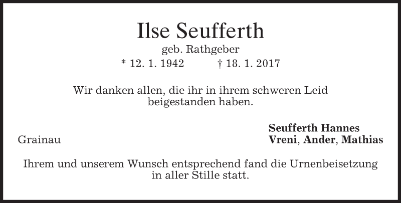 Hier finden Sie alle Traueranzeigen aus der Zeitung, die bisher für Ilse Seufferth erschienen sind. Weitere Traueranzeigen, die in der Zeitung erscheinen, werden hier ebenfalls aufgelistet