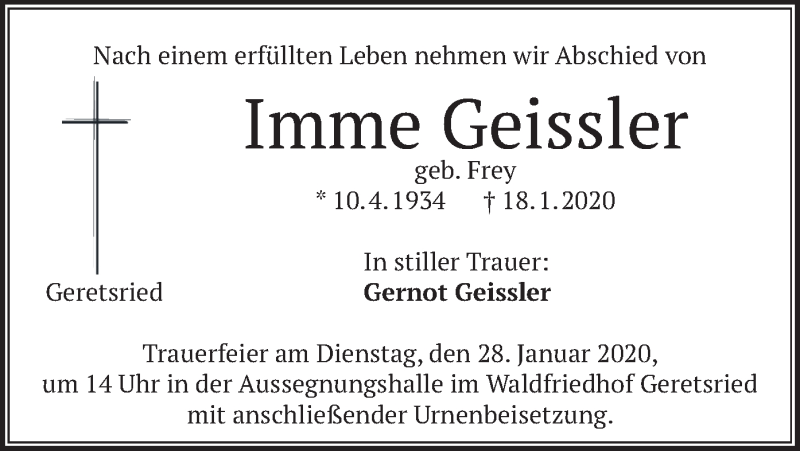 Hier finden Sie alle Traueranzeigen aus der Zeitung, die bisher für Imme Geissler erschienen sind. Weitere Traueranzeigen, die in der Zeitung erscheinen, werden hier ebenfalls aufgelistet