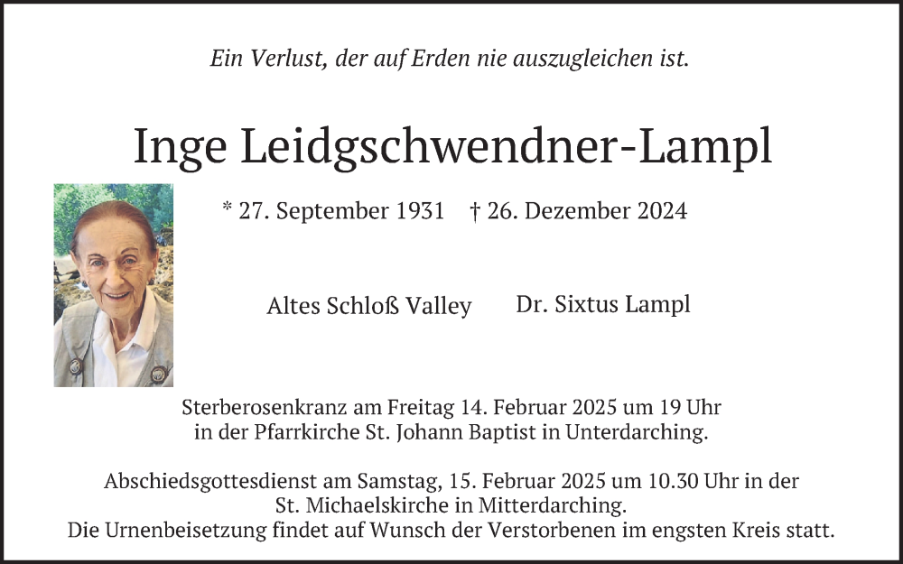 Hier finden Sie alle Traueranzeigen aus der Zeitung, die bisher für Inge Leidgschwendner-Lampl erschienen sind. Weitere Traueranzeigen, die in der Zeitung erscheinen, werden hier ebenfalls aufgelistet