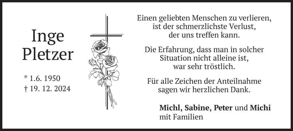 Hier finden Sie alle Traueranzeigen aus der Zeitung, die bisher für Inge Pletzer erschienen sind. Weitere Traueranzeigen, die in der Zeitung erscheinen, werden hier ebenfalls aufgelistet