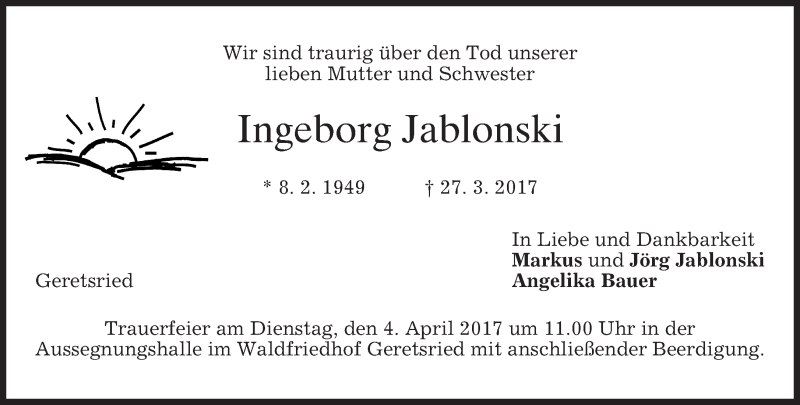 Hier finden Sie alle Traueranzeigen aus der Zeitung, die bisher für Ingeborg Jablonski erschienen sind. Weitere Traueranzeigen, die in der Zeitung erscheinen, werden hier ebenfalls aufgelistet