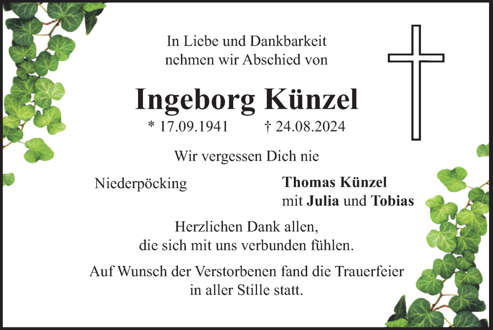 Hier finden Sie alle Traueranzeigen aus der Zeitung, die bisher für Ingeborg Künzel erschienen sind. Weitere Traueranzeigen, die in der Zeitung erscheinen, werden hier ebenfalls aufgelistet