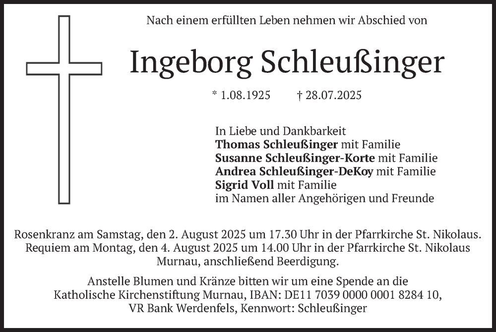 Hier finden Sie alle Traueranzeigen aus der Zeitung, die bisher für Ingeborg Schleußinger erschienen sind. Weitere Traueranzeigen, die in der Zeitung erscheinen, werden hier ebenfalls aufgelistet