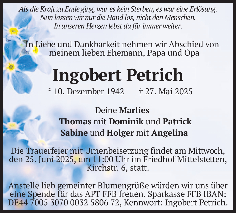 Hier finden Sie alle Traueranzeigen aus der Zeitung, die bisher für Ingobert Petrich erschienen sind. Weitere Traueranzeigen, die in der Zeitung erscheinen, werden hier ebenfalls aufgelistet