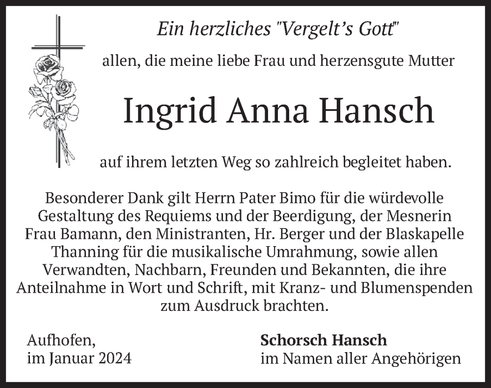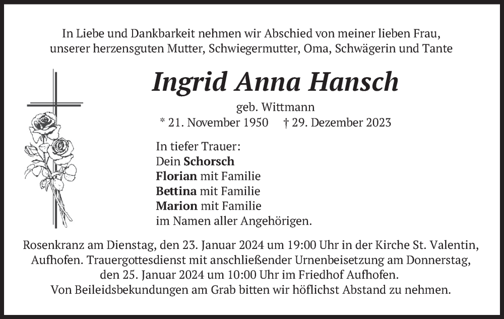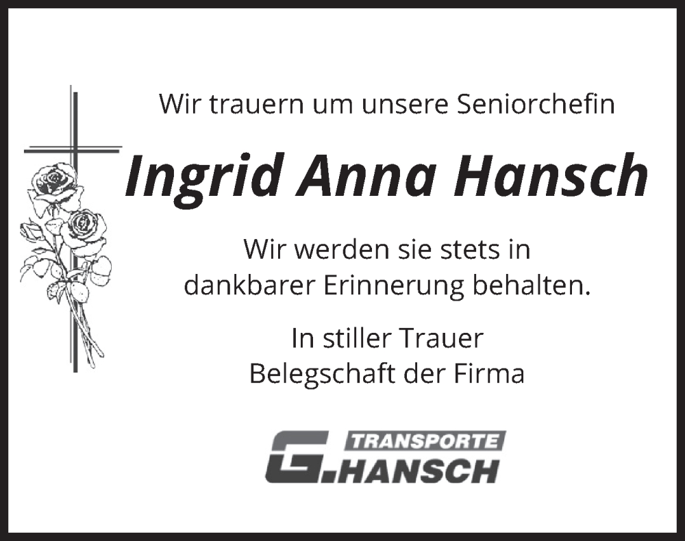 Hier finden Sie alle Traueranzeigen aus der Zeitung, die bisher für Ingrid Anna Hansch erschienen sind. Weitere Traueranzeigen, die in der Zeitung erscheinen, werden hier ebenfalls aufgelistet