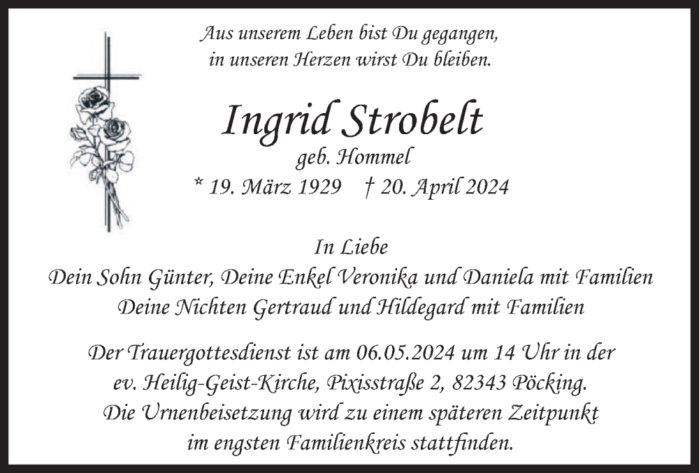 Hier finden Sie alle Traueranzeigen aus der Zeitung, die bisher für Ingrid Strobelt erschienen sind. Weitere Traueranzeigen, die in der Zeitung erscheinen, werden hier ebenfalls aufgelistet