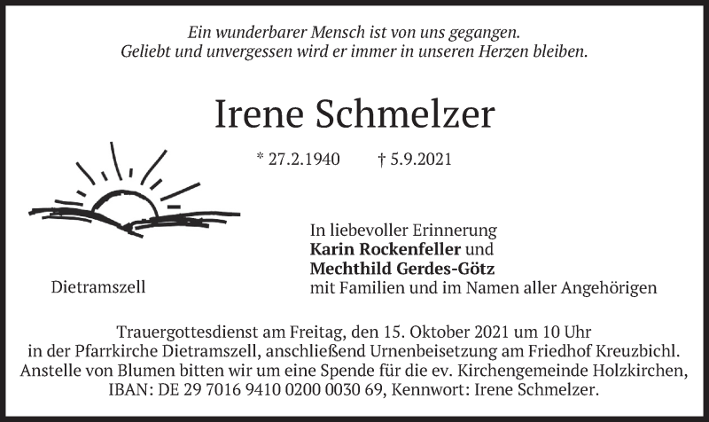 Hier finden Sie alle Traueranzeigen aus der Zeitung, die bisher für Irene Schmelzer erschienen sind. Weitere Traueranzeigen, die in der Zeitung erscheinen, werden hier ebenfalls aufgelistet