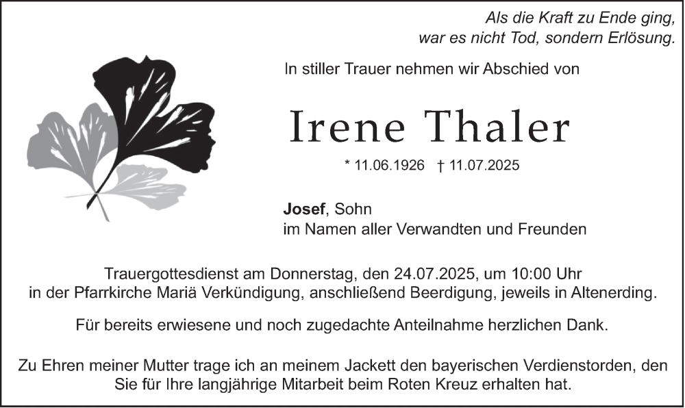 Hier finden Sie alle Traueranzeigen aus der Zeitung, die bisher für Irene Thaler erschienen sind. Weitere Traueranzeigen, die in der Zeitung erscheinen, werden hier ebenfalls aufgelistet