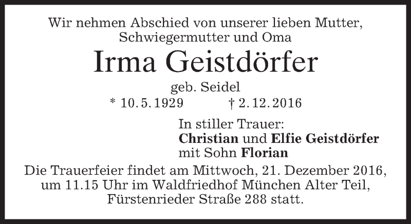 Hier finden Sie alle Traueranzeigen aus der Zeitung, die bisher für Irma Geistdörfer erschienen sind. Weitere Traueranzeigen, die in der Zeitung erscheinen, werden hier ebenfalls aufgelistet