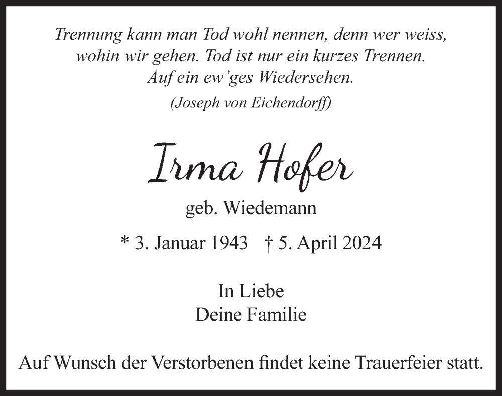 Hier finden Sie alle Traueranzeigen aus der Zeitung, die bisher für Irma Hofer erschienen sind. Weitere Traueranzeigen, die in der Zeitung erscheinen, werden hier ebenfalls aufgelistet