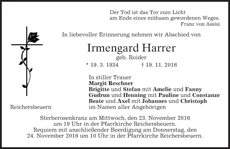 Hier finden Sie alle Traueranzeigen aus der Zeitung, die bisher für Irmengard Harrer erschienen sind. Weitere Traueranzeigen, die in der Zeitung erscheinen, werden hier ebenfalls aufgelistet
